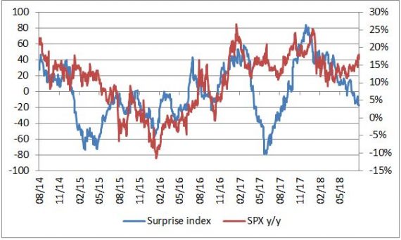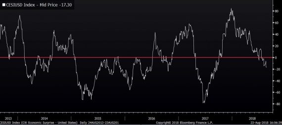 Americký index ekonomických prekvapení sa dostal po takmer roku do mínusu. Neznamená to, že sa americkej ekonomike darí zle, ale to že dáta zaostávajú za očakávaniami (a tie nie sú nízke).
