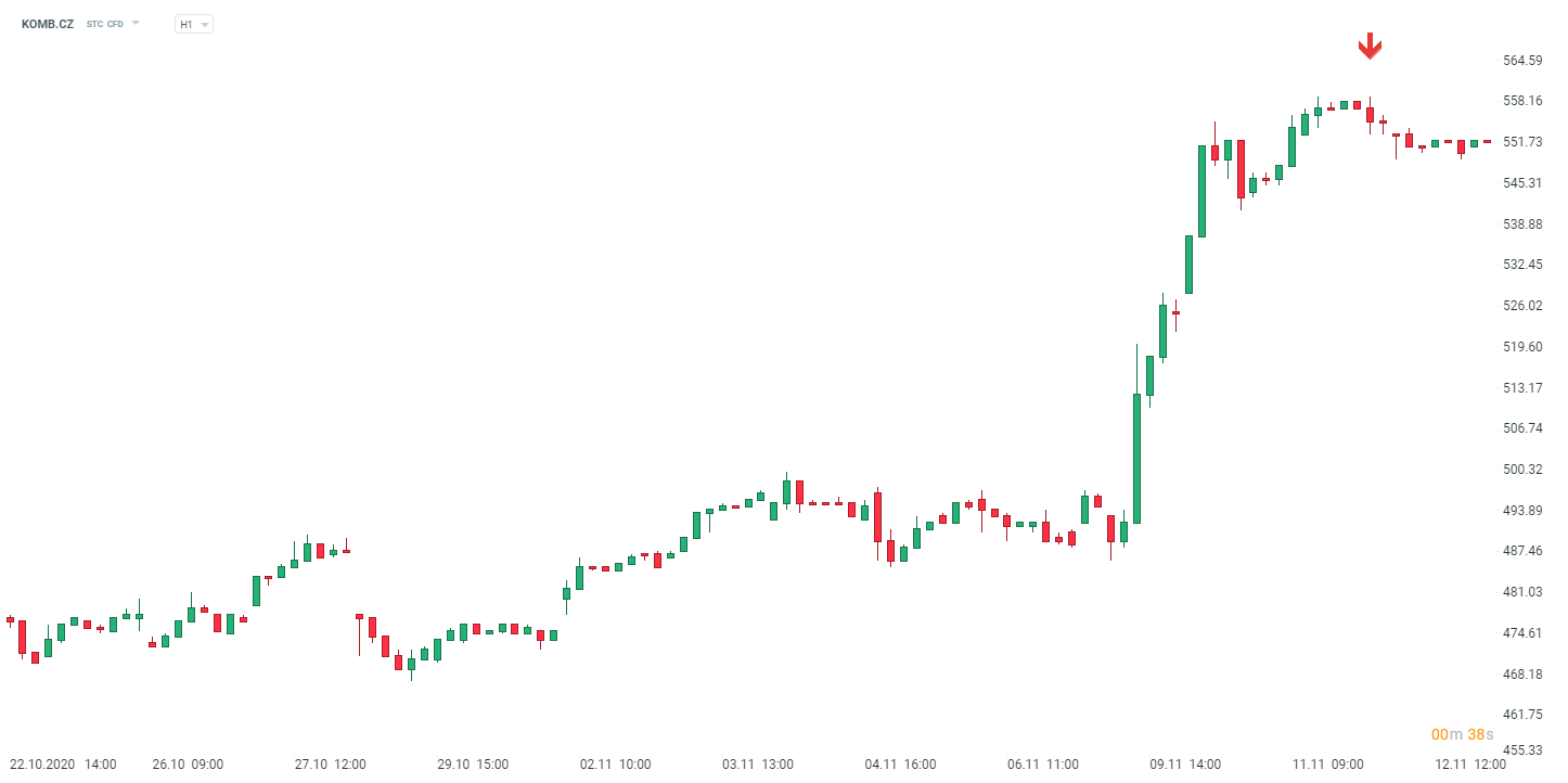 Komerční banka (KOMB.CZ) si i přes dnešní pokles drží většinu zisků, které nabrala na počátku týdne. Ve srovnání s pátečním závěrem je akcie o více než 10 % dražší. Zdroj: xStation5