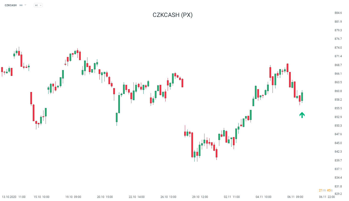 Index CZKCASH (PX) pražské burzy snížil v samém závěru standardní seance ztráty. Zdroj: xStation5