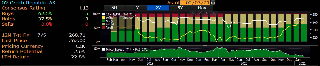 Akcie O2 pokrývá 8 analytiků oslovených agenturou Bloomberg. Většina (5) doporučuje akcie ke koupi. Aktuální cena se však nachází takřka na úrovni 12 měsíční cílové ceny. Zdroj: Bloomberg