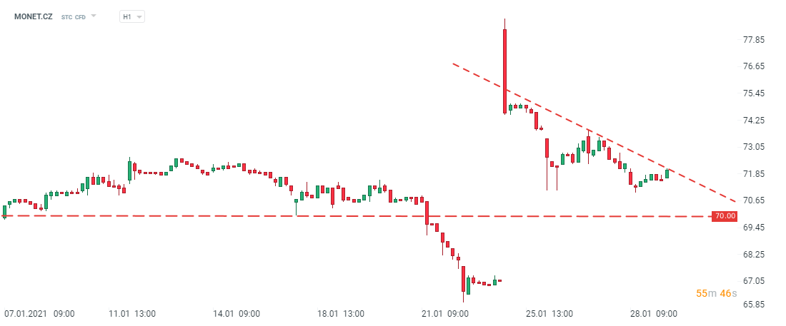 Akcie Monety Money Bank pokračují po pondělním výstřelu v poklesu. Cena se opět přibližíla úrovni 70 Kč za akcii. Představenstvo Monety se má k nabídce PPF vyjádřit do 29. ledna. Hlavní slovo však budou mít akcionáři. Zdroj: xStation5