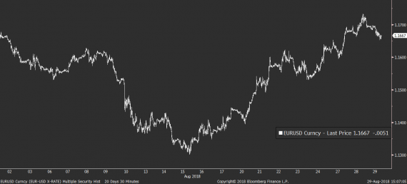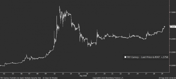 Z důležitějších témat dnes zaujalo například dění na turecké liře, která začíná opět nepříjemně slábnout. Jen během dneška ztrácí už více než 2,5 % a i když ještě neatakuje úrovně ze začátku srpna, její další pád může mít brzy vliv jak na globální rizikový profil, tak na evropské akciové indexy.