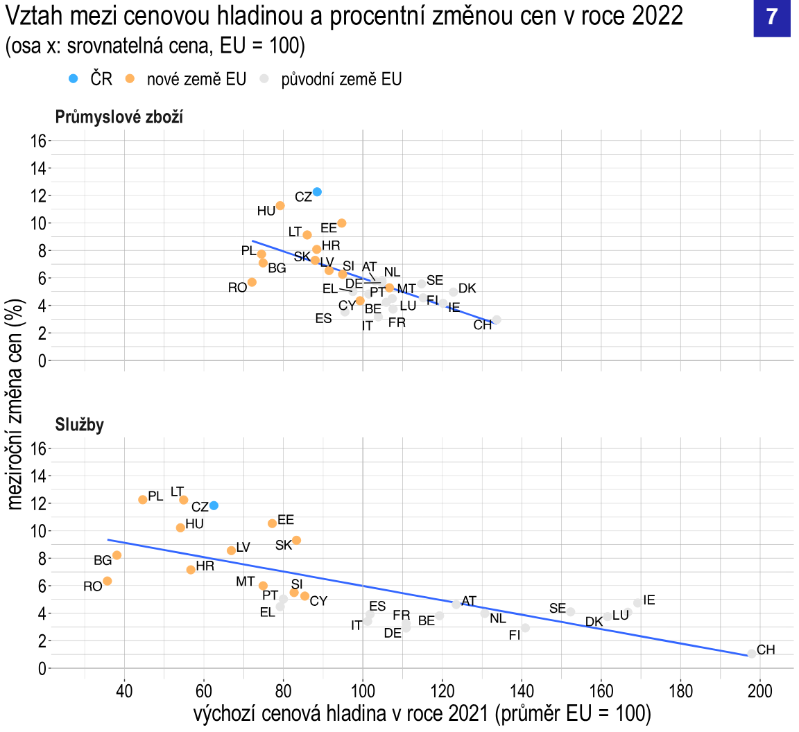Závislost mezi relativní velikostí spotřebního koše EU v roce 2021 a inflací v roce 2022 Zdroj: ČNB.