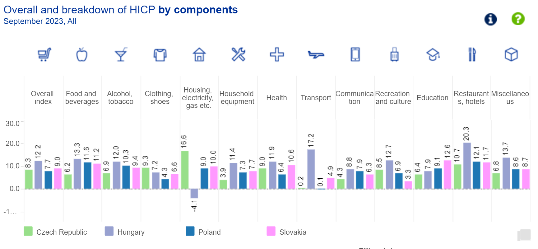 Výrazně si polepšila i Česká republika, kde se ceny v září meziročně zvýšily pouze o 8,3 % oproti srpnovým 10,1 %. Tento výrazný pokles je opět částečně způsoben odchodem vysokých meziměsíčních přírůstků, ale také meziměsíčním poklesem cen v září o 0,8 %. V příštím měsíci však ještě dojde k dalšímu statistickému paradoxu, kdy meziroční inflace výrazně vzroste, neboť z okna 12 klidných měsíců bude vyjmut měsíc, kdy ceny výrazně poklesly v důsledku zavedení spořicího tarifu.