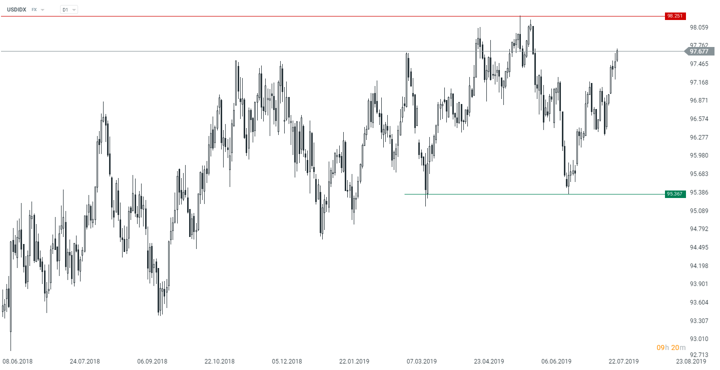 Americký dolar v reakci na data HDP mírně vzrostl. Výnosy z desetiletých dluhopisů přidaly 3 bps na 2,1 %. Zdroj: xStation5