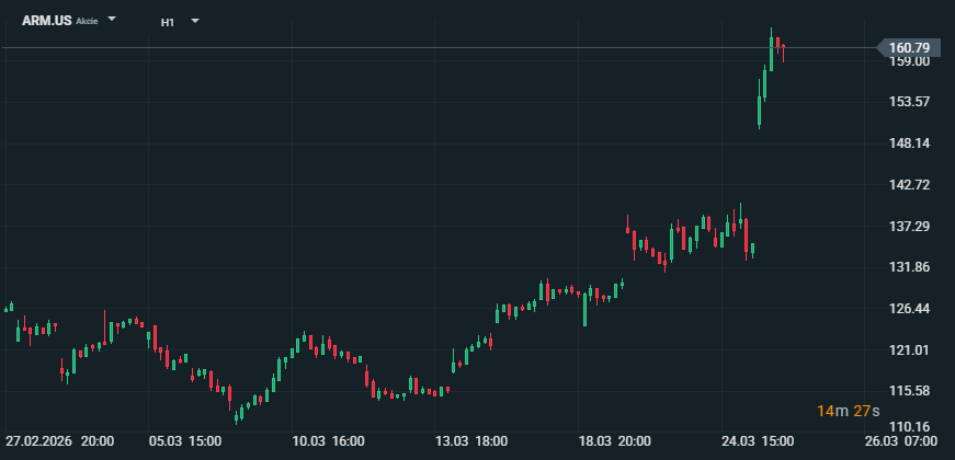 Graf Armu by ukázal ještě prudší růst, když akcie otevřely na 148,37 USD, dosáhly 163,71 USD a obchodovaly se kolem 159,83 USD. Tento pohyb pomáhá vysvětlit i růst Intelu, protože trh novou AI CPU novinku vyhodnotil jako býčí signál pro širší poptávku po datacentrových CPU, nejen pro jednu firmu. Zdroj: xStation5