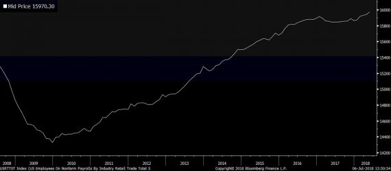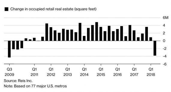 Hoci sa situácia ohľadom vytláčania kamenných predajní internetovými predajcami nachvíľu upokojila, tak z USA opäť došli čísla, ktoré naznačujú, že tento proces prebieha naďalej. V druhom kvartáli klesla obsadená maloobchodná plocha obchodmi o takmer 4 mil. štvorcových stôp. Bol to najväčší pokles od krízy. Primárne je za to zodpovedný krach siete hračkárskych obchodov Toys „R“ US. V problémoch sú však aj iní tradiční maloobchodníci a takáto situácia sa pokojne môže zopakovať.