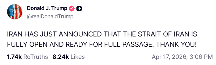 Írán podle vyjádření ministra zahraničí Abbáse Arakčího oznámil, že Hormuzský průliv je po dobu trvání příměří znovu zcela otevřen pro komerční lodní dopravu. Na zprávu následně reagoval i americký prezident Donald Trump, který uvedl, že průliv je plně otevřen a připraven pro běžný provoz.