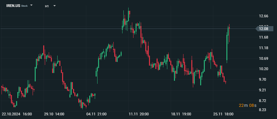 Vývoj akcií Iris Energy (IREN) v posledních pěti týdnech ukazuje volatilní pohyb s prudkým nárůstem ceny k 26. listopadu 2024. Analýza pomocí cenových svíček na hodinovém grafu. Zdroj: xStation5.