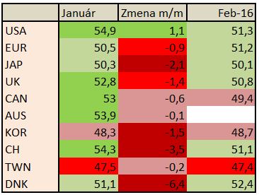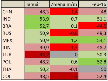 V spektre rozvíjajúcich sa ekonomík sa to červená viac. V hlbokej recesii ostáva kvôli problémom súvisiacim s kolapsom líryTurecko, do solídneho poklesu sa však dostala Čína, ktorá so sebou ťahá nadol aj niektoré ďalšie ekonomiky v regióne – Indonézia aj Thajsko aktuálne vykazujú stagnáciu. Mimo čínskej sféry vplyvu to však vyzerá lepšie, Brazília a India hlásia solídny rast, Rusko a Mexiko mierny. Pokles hlásia v Poľsku a po novom aj v Kolumbii, kde sa v januári výrobná dôvera prepadla. Brazília a Mexiko ukazujú, že krajinám v ekonomickej sfére USA sa darí lepšie. Podobne pri vyspelých ekonomikách aj Kanada.