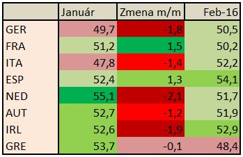 Čo sa týka eurozóny, tak spomedzi tých krajín, ktoré vykazujú tieto indexy, tak vo väčšine je badať výrazné spomalenie. V Taliansku aktivita klesá relatívne silným tempom, v Nemecku mierne, naopak v januári si polepšilo Francúzsko a relatívne dobre na tom ostáva Španielsko. Menšie ekonomiky, ktoré obvykle nasledujú tie väčšie s niekoľkomesačným oneskorením síce spomaľujú, a to dosť silno, stále však hlásia solídnu expanziu, a to predovšetkým Holandsko. Je však reálne, že v najbližších mesiacoch budú nasledovať nadol štyri najväčšie ekonomiky.