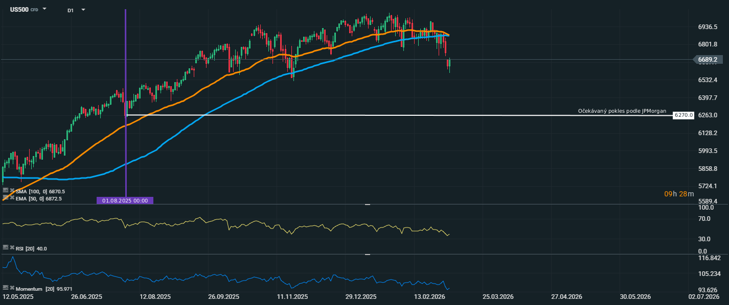 Z technického pohledu bude nyní důležité sledovat, zda se index dokáže stabilizovat nad aktuální oblastí kolem 6650–6690 bodů. Pokud by se tlak na prodej dále zvýšil, trh se může postupně přiblížit k vyznačené hladině 6270 bodů, kterou JPMorgan označuje jako možný cíl korekce. To by znamenalo další citelné oslabení oproti současným úrovním. Naopak pro zlepšení nálady by se index musel vrátit zpět nad 6870 bodů, kde se nyní nachází důležitá zóna odporu.