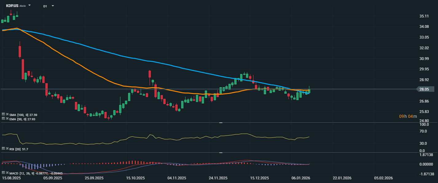 Akcie společnosti Keurig Dr Pepper se aktuálně obchodují na ceně 28,05 USD a technicky se nacházejí na zajímavém bodě zlomu. Cena totiž právě prorazila nad klouzavý průměr EMA 50 (27,93 USD) i nad SMA 100 (27,59 USD), což může signalizovat možný obrat trendu po předchozím období slabšího výkonu. RSI dosahuje hodnoty 51,7, tedy je v neutrálním pásmu s mírným náznakem růstového momenta. Z krátkodobého pohledu je nyní důležité sledovat, zda cena dokáže udržet se nad 28 USD a potvrdit tak průraz nad dlouhodobé průměry. Pokud ano, může to být impuls k dalšímu růstu směrem k rezistencím v pásmu 29,50–30,50 USD. Naopak návrat pod 27,50 USD by mohl značit falešný průraz a riziko další konsolidace.