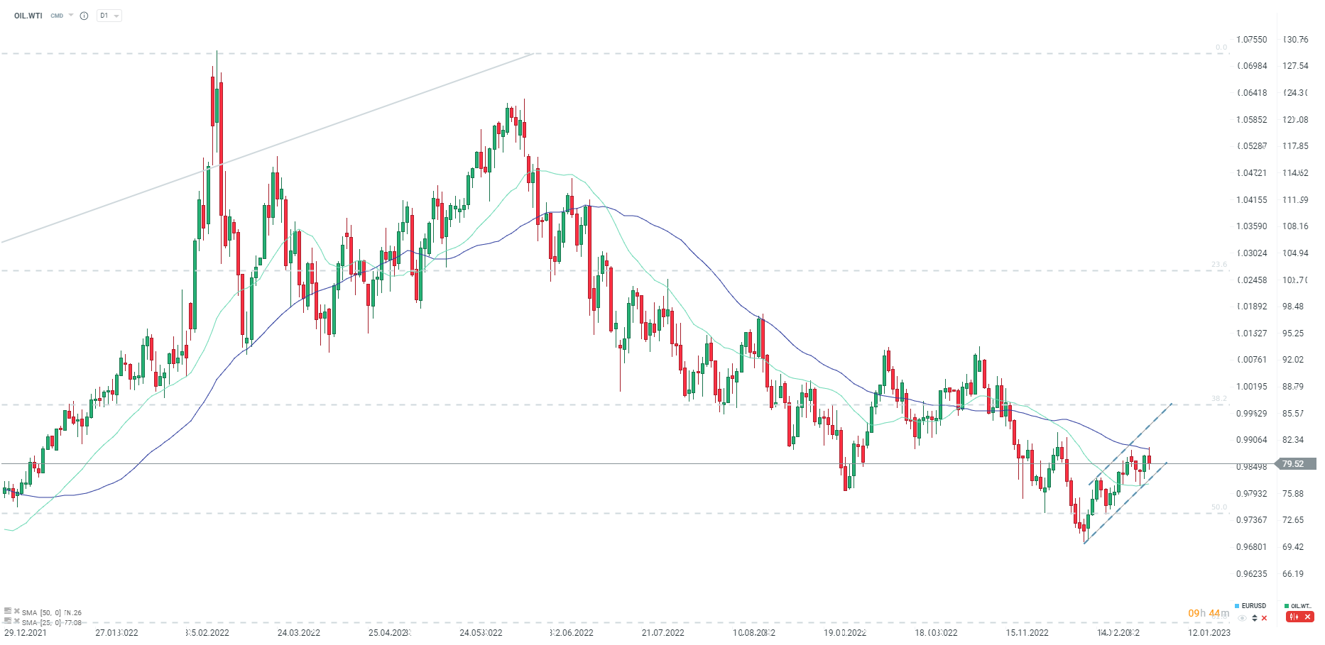 WTI zahájila nový týden býčím růstem, ale výrazné úterní posílení USD omezilo zisky a vyvolalo pokles k 25sekčnímu klouzavému průměru. Ropa zůstává v růstovém kanálu. Zdroj: xStation5