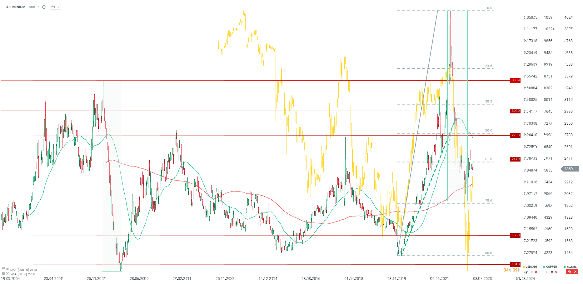 Ceny hliníku se v roce 2022 propadly, podobně jako v roce 2008. V současné době však můžeme pozorovat posilování čínského jüanu, které by teoreticky mělo poskytnout podporu cenám hliníku. Pokud Čína po pandemii skutečně znovu otevře svou ekonomiku a dojde k hospodářskému oživení, může se hliník vrátit na vyšší cenové úrovně. Zdroj: xStation5