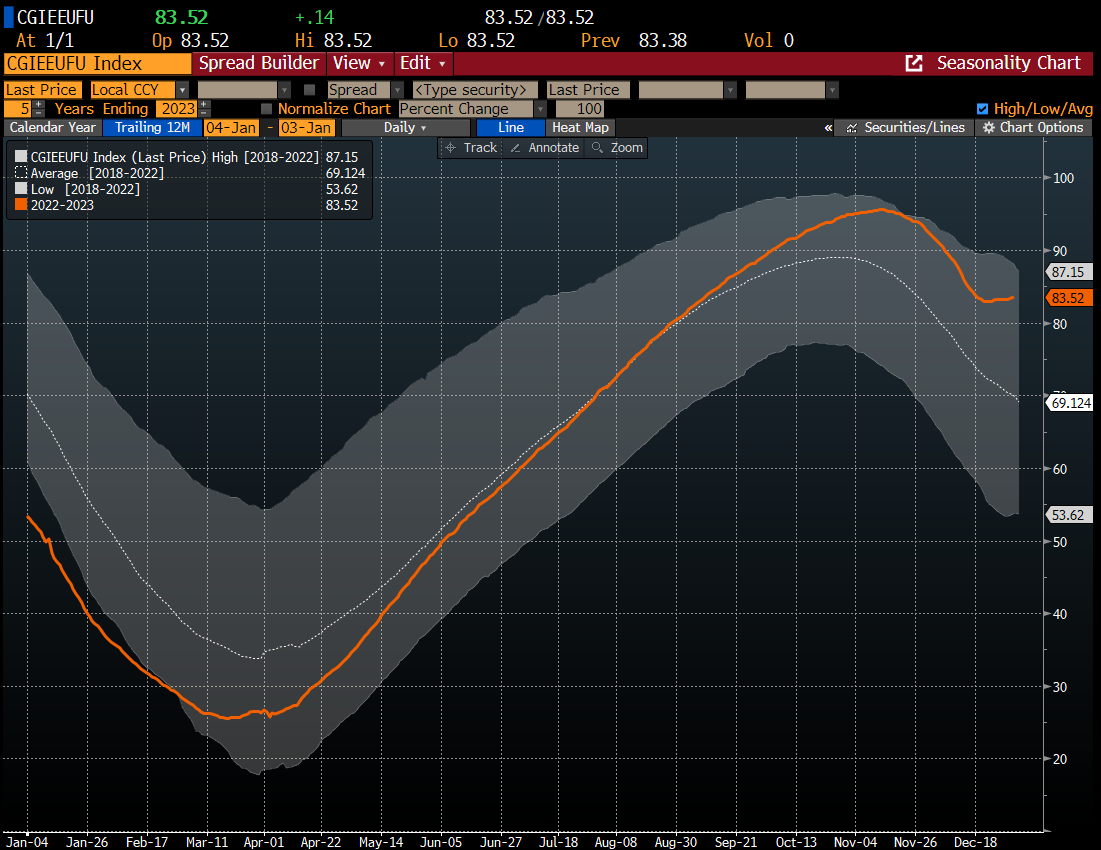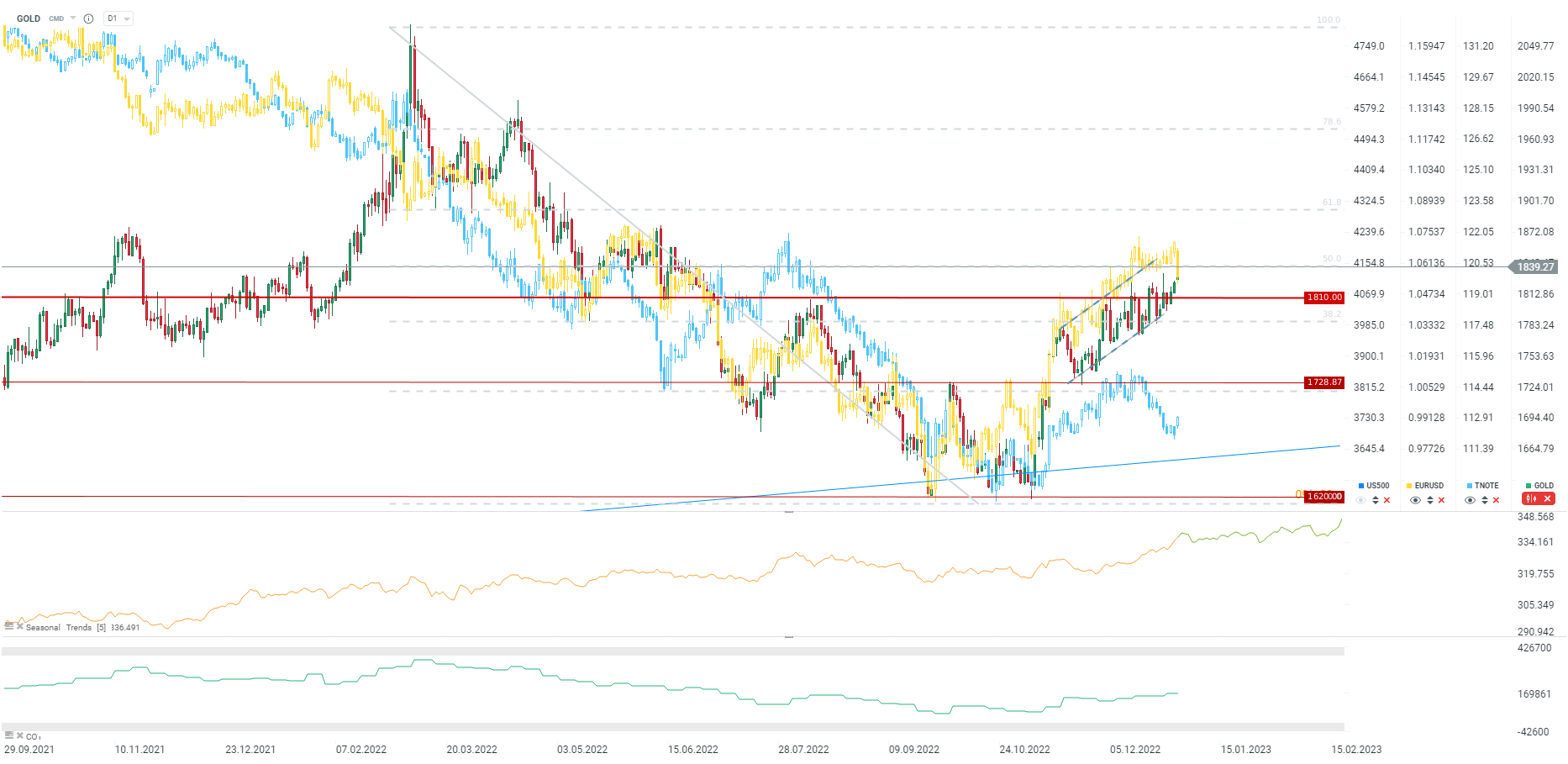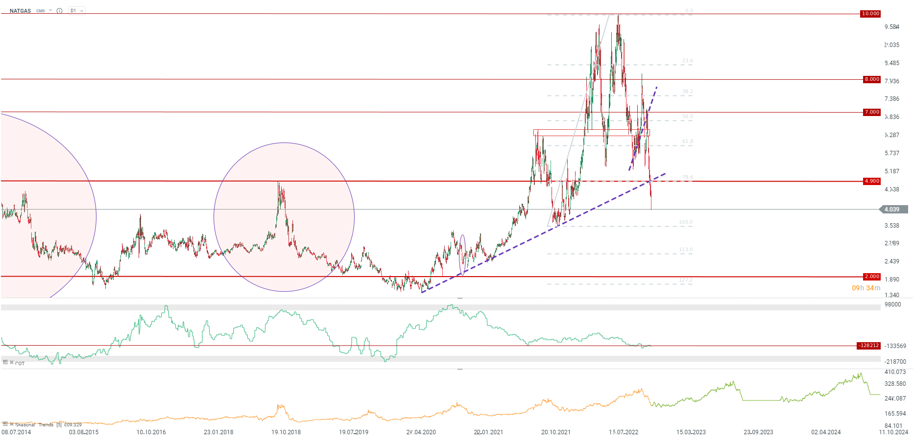 Klíčová podpora v blízkosti 5,00 USD za MMBTu byla prolomena na konci roku 2022. Další důležitá zóna podpory je vyznačena minimy z prosince 2021. Sezónní vzorce naznačují, že by se cena měla obchodovat do strany až do začátku března. Zdroj: xStation5