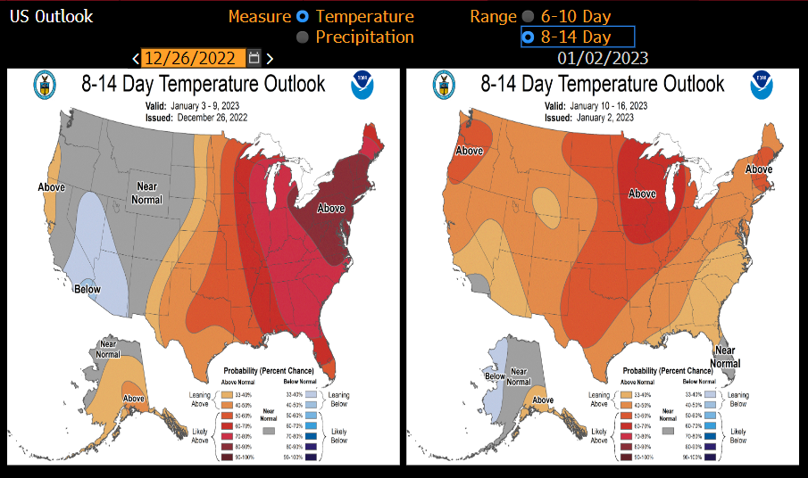 Předpovědi počasí se nemění - očekává se, že vysoké teploty ve Spojených státech potrvají nejméně do poloviny ledna. Zdroj: Bloomberg