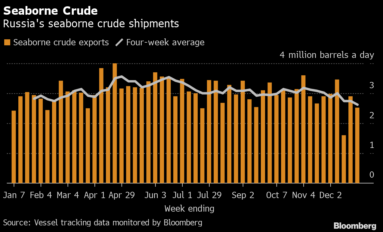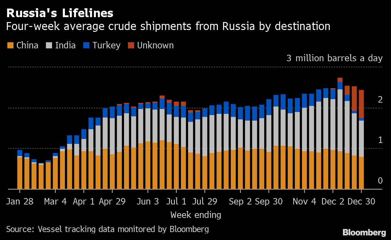 Až 0,5 mbpd ruské ropy odcházející v posledním prosincovém týdnu mělo "neznámé určení". Současně poklesly dodávky úředníků do Turecka, což může naznačovat, že se tato země bude snažit ruský produkt dále prodávat