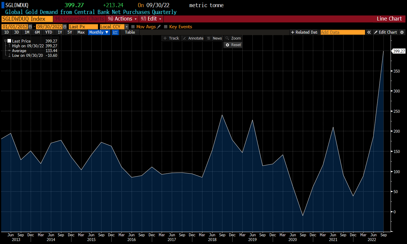 Čistá změna v držbě zlata centrálních bank ve 3. čtvrtletí 2022 byla největší za posledních nejméně 10 let. Celý rok 2022 by mohl zaznamenat největší nárůst za dlouhou dobu. Očekává se však, že Čína nakupuje ještě více, než uvádí. Zdroj: Bloomberg