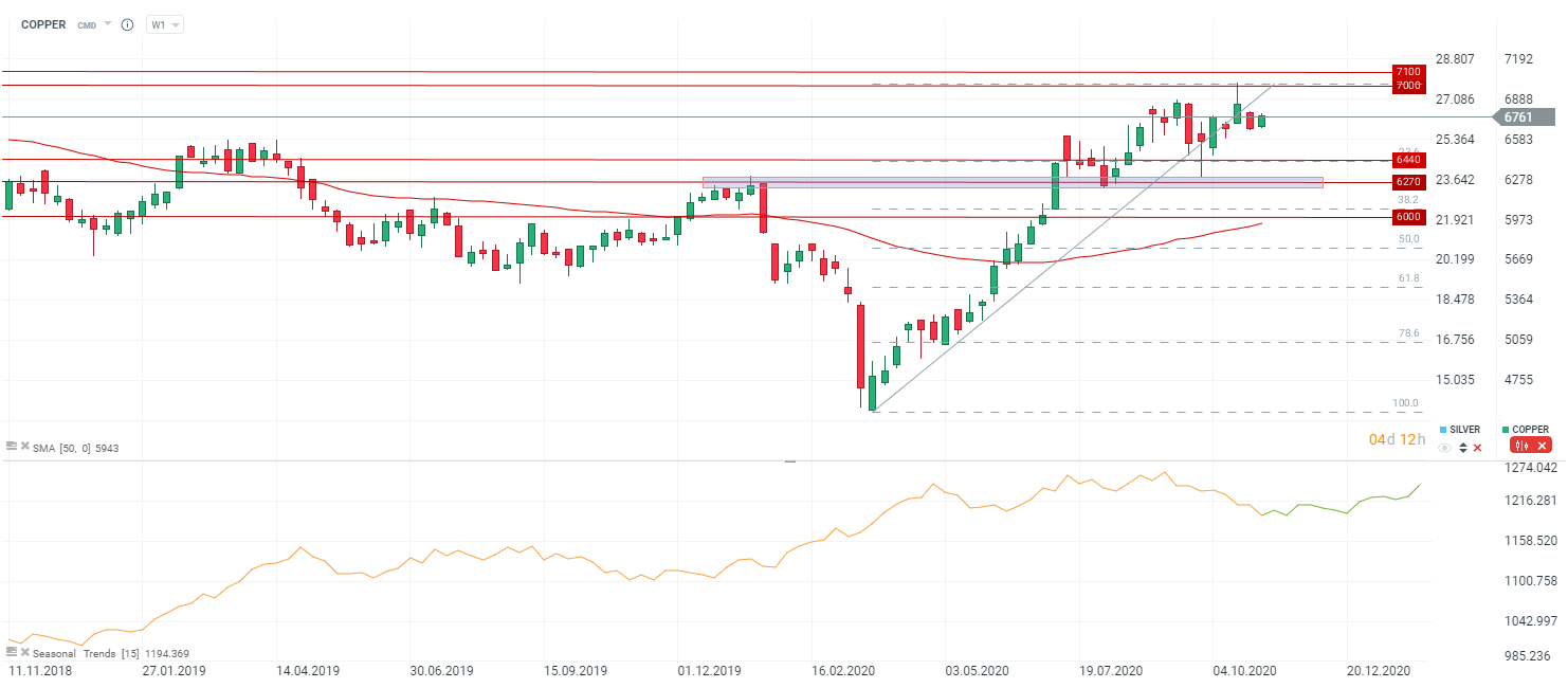 Cena mědi zůstává vysoká i přes určité varovné signály z trhu. Potenciální korekce by mohla dosáhnout hladiny podpory na 6 300 dolarech za tunu. Zdroj. xStation5