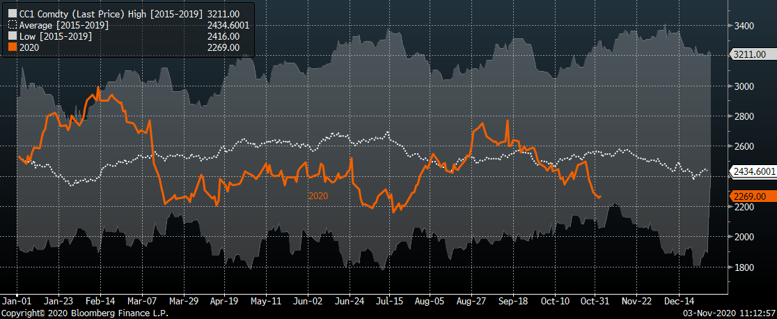 Cena kakaa se v poslední době pohybovala pod pětiletým průměrem. Pokud však vezmeme v úvahu sezonalitu, tak by mohly pokračovat v poklesu až do Q1/2021. Zdroj: Bloomberg