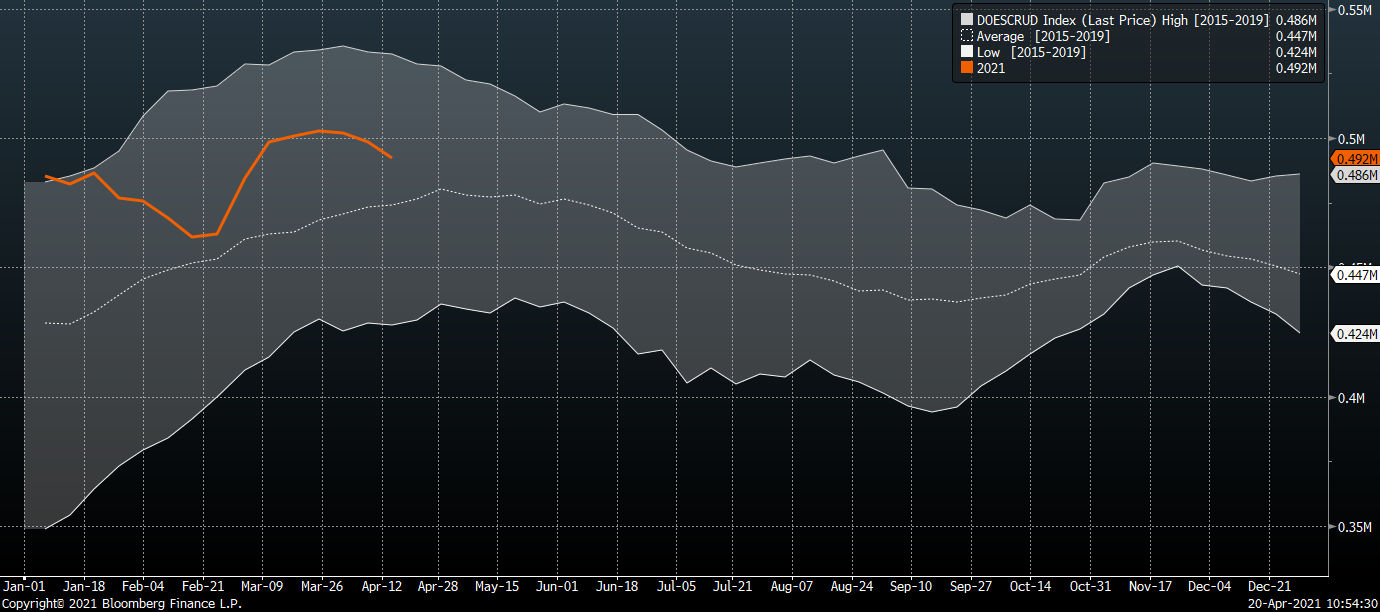 Zásoby ropy se blíží sezónnímu maximu. Zdroj: Bloomberg
