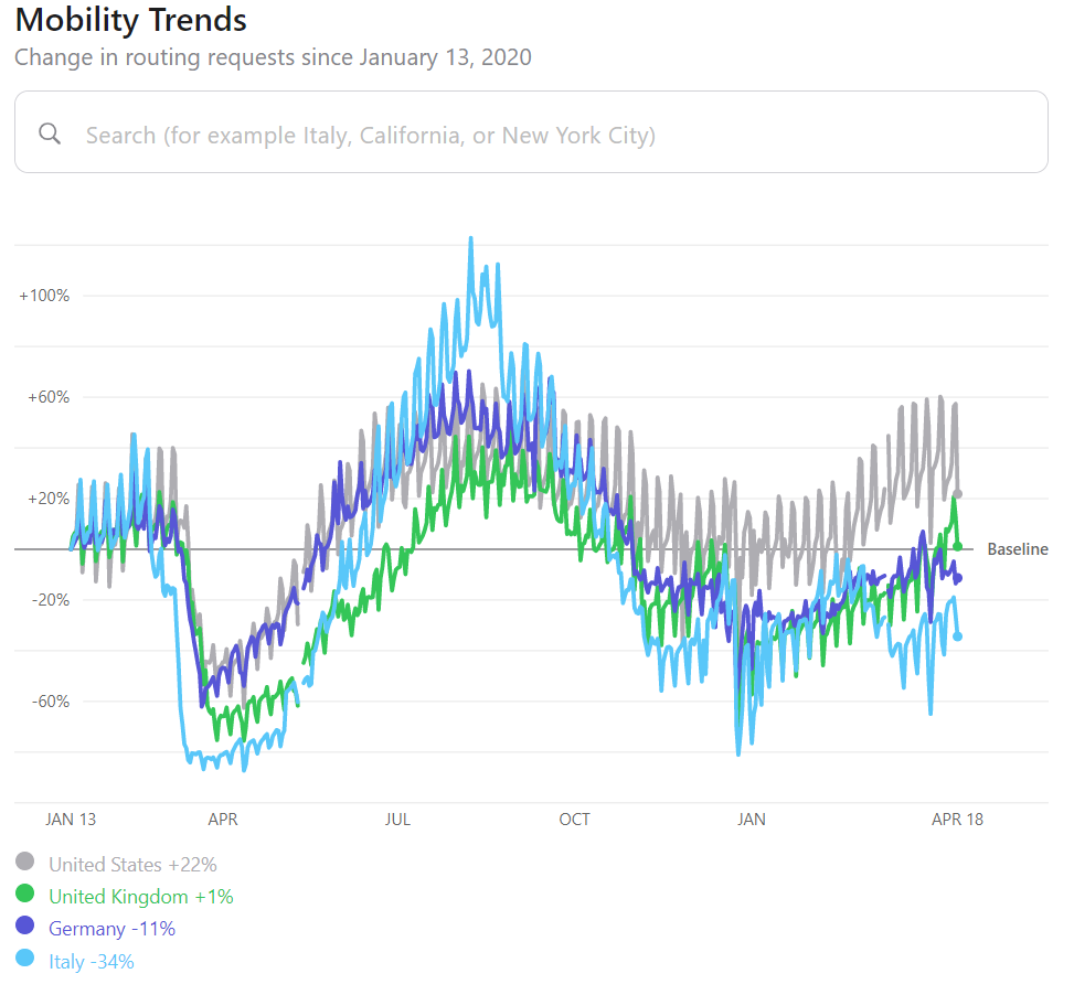 Aktuální situace mobility v USA vypadá podobně jako maxima minulého roku. Ve Velké Británii se situace zlepšuje. Nicméně ve zbytku Evropy mobilita stále pokulhává - jako v případě Německa a Itálie. Zdroj: Apple