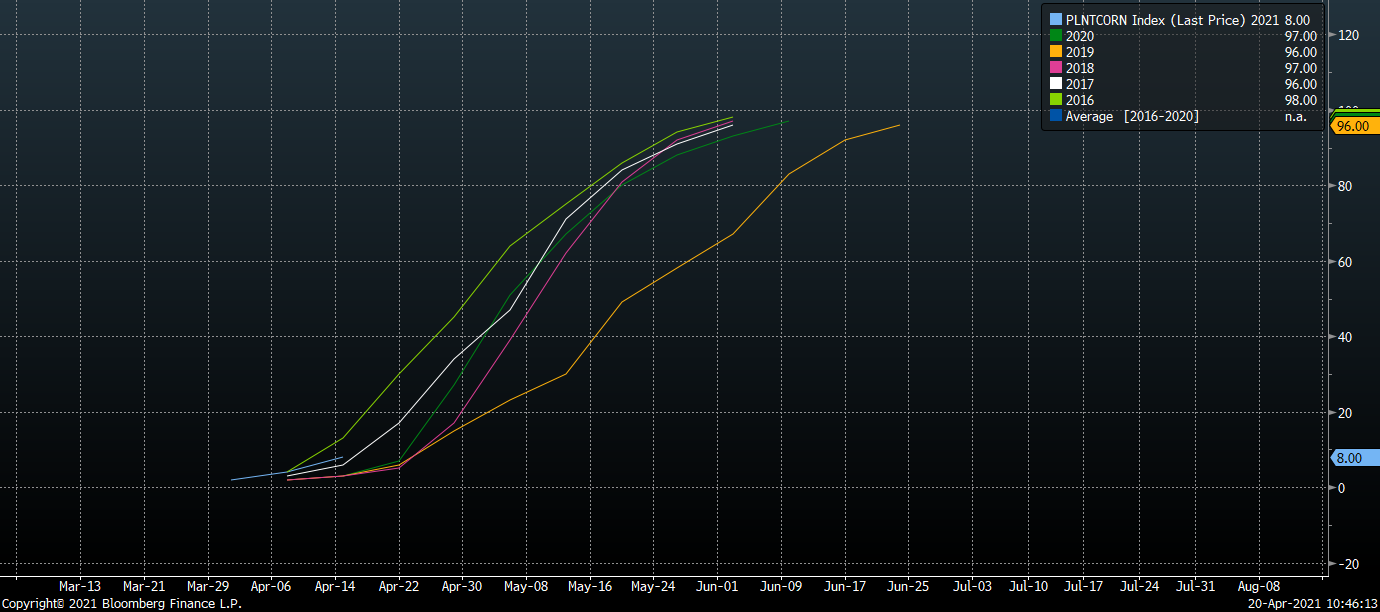 Množství oseté plochy v USA zůstává nad 5 letým průměrem pro toto období (pod očekávání trhu). Nízké teploty by mohly zbrzdit osívání dalších ploch. Zdroj: Bloomberg