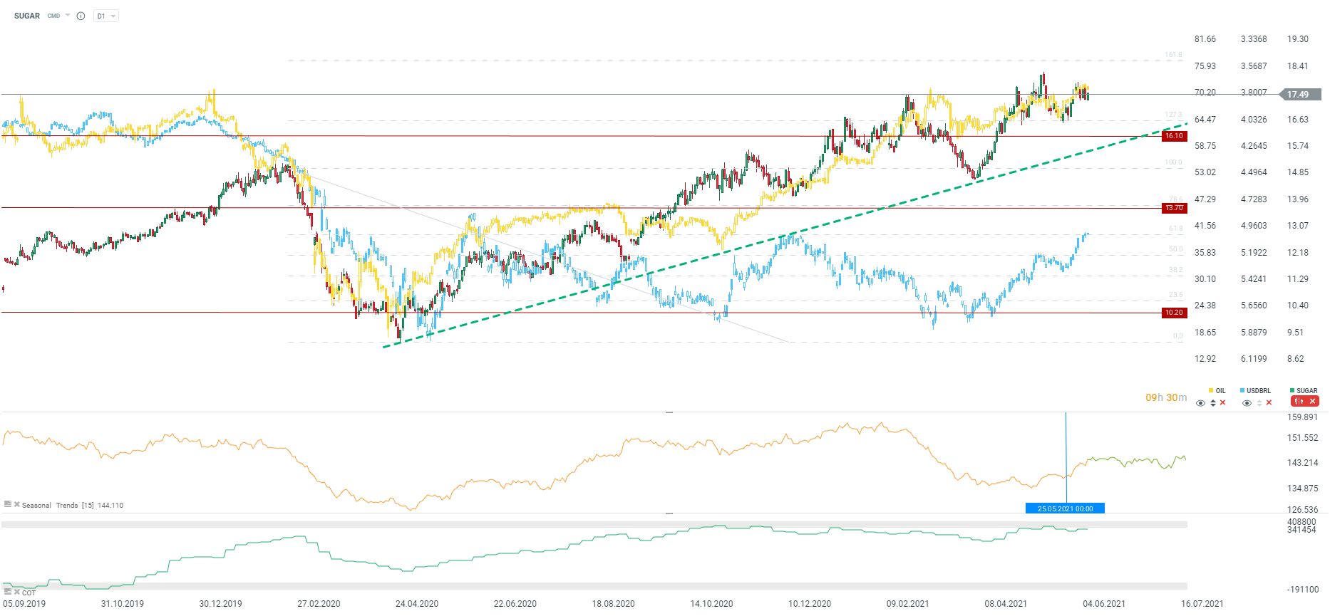 - Nicméně cukr v poslední době konsolidoval, nedostal se přes lokální maxima z provní poloviny května