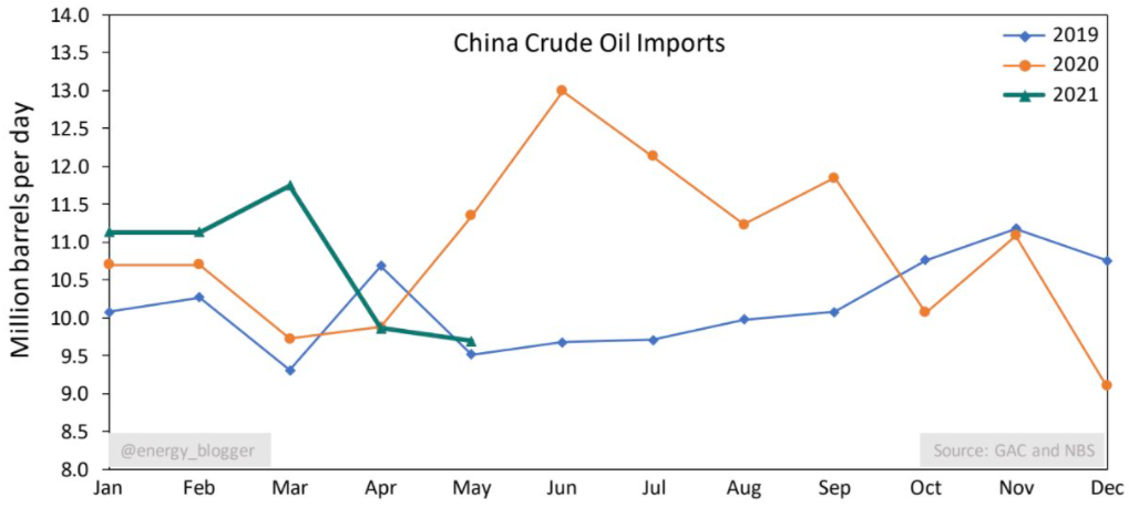 Ropné importy do Číny jsou o mnoho nižší, než byly v minulém roce. Další omezení importů by mohlo limitovat rostoucí cenový trend. Zdroj: GAC, NBS, @energy_blogger