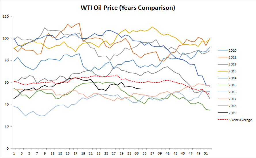 - Ceny ropy se nacházejí relativně nízko vzhledem k úrovním poslední dekády. Na základě pětiletého průměru bychom mohli v blízkých měsících očekávat stabilizaci ceny