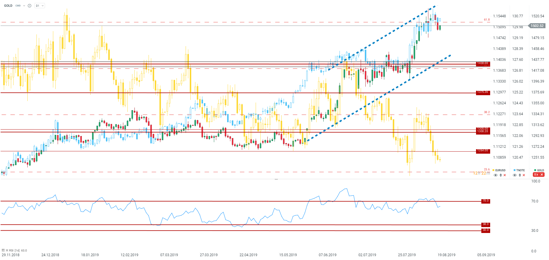 - Cena zlata zatím zastavila růst na důležité technické úrovni - 1500 dolarů za unci, která je navíc podpořena 61,8 % Fibo retracementem klesající vlny z období 2012 - 2015