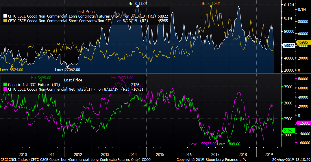 Net-spekulativní pozice aktuálně nedávají žádný důležitý signál, ovšem za povšimnutí stojí výrazný nárůst počtu short pozic velkých obchodníků. Zdroj: Bloomberg