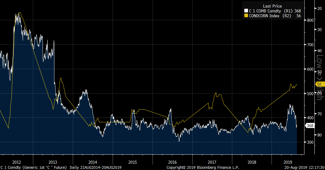 Kvalita kukuřice je nízká (inverzní křivka) a může za to počasí. Zdroj: Bloomberg