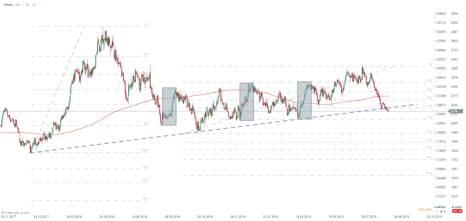 - Ceny kakaa na trhu ovšem padají pod důležitý support na 2200 dolarech za tunu, 61,8 % retracement a rostoucí trendovou čáru