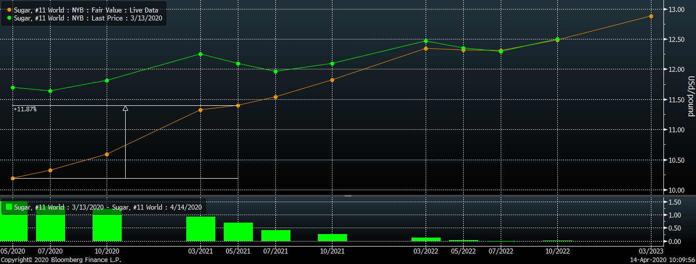 Trh s cukrem se stále nachází ve stavu contanga. Futures křivka je v posledním měsíci docela plochá