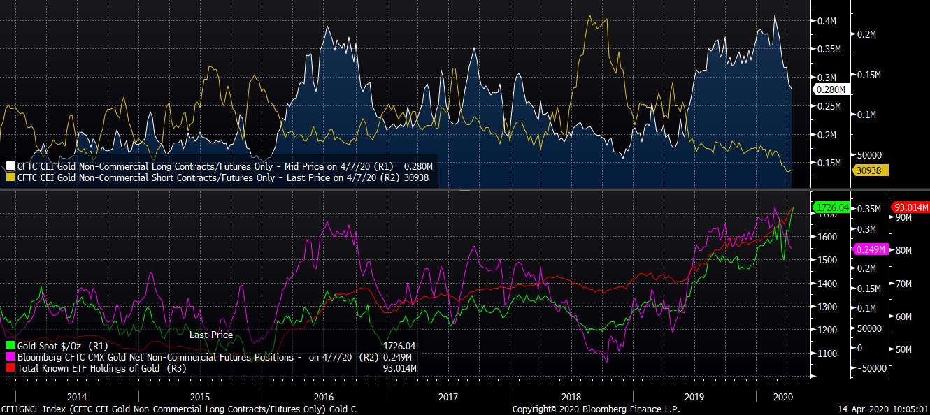 ETF fondy pokračují v nákupech zlata, zatímco klesá počet long i short pozic velkých obchodníků. Zdroj: Bloomberg