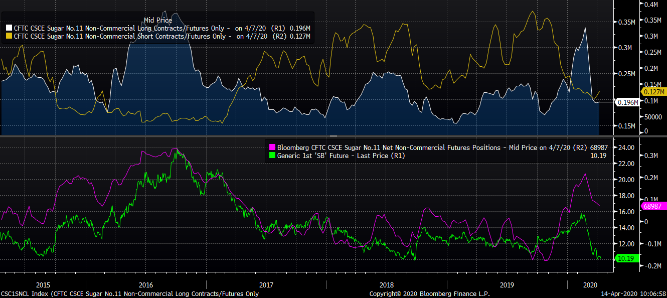 Na trhu klesá počet net-long pozic velkých obchodníků. Naopak short pozice začínají růst, což by mohl vytvořit další tlak na cenu. Ta by mohla zamířit až k úrovni 8,50 centů za libru - lokální minima z roku 2007. Zdroj: Bloomberg