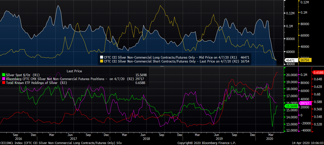 ETF zvyšují robustně nákupy stříbra. Na druhou stranu počty long pozic v poslední době výrazně klesly. Zdroj: Bloomberg
