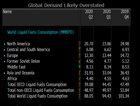 Dle Bloombergu je výhled poptávky po ropě nadhodnocený. Ve Q2/2020 by poptávka měla klesnout okolo 13 mbpd ve srovnání s koncem roku 2019. Poptávka po ropě v Číně ve Q1 vzrostla, ale hlavním důvodem bylo naplnění strategických rezerv. Zdroj: Bloomberg