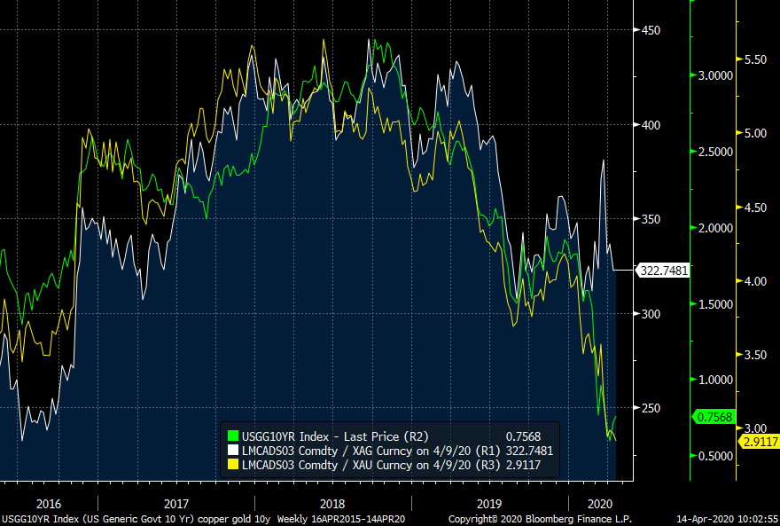 Stříbro vypadá podhodnoceně ve srovnání s vývojem cen mědi a také vývojem výnosů amerických dluhopisů a cen zlata. Na grafu jsou zobrazeny poměry cen. Zdroj: Bloomberg