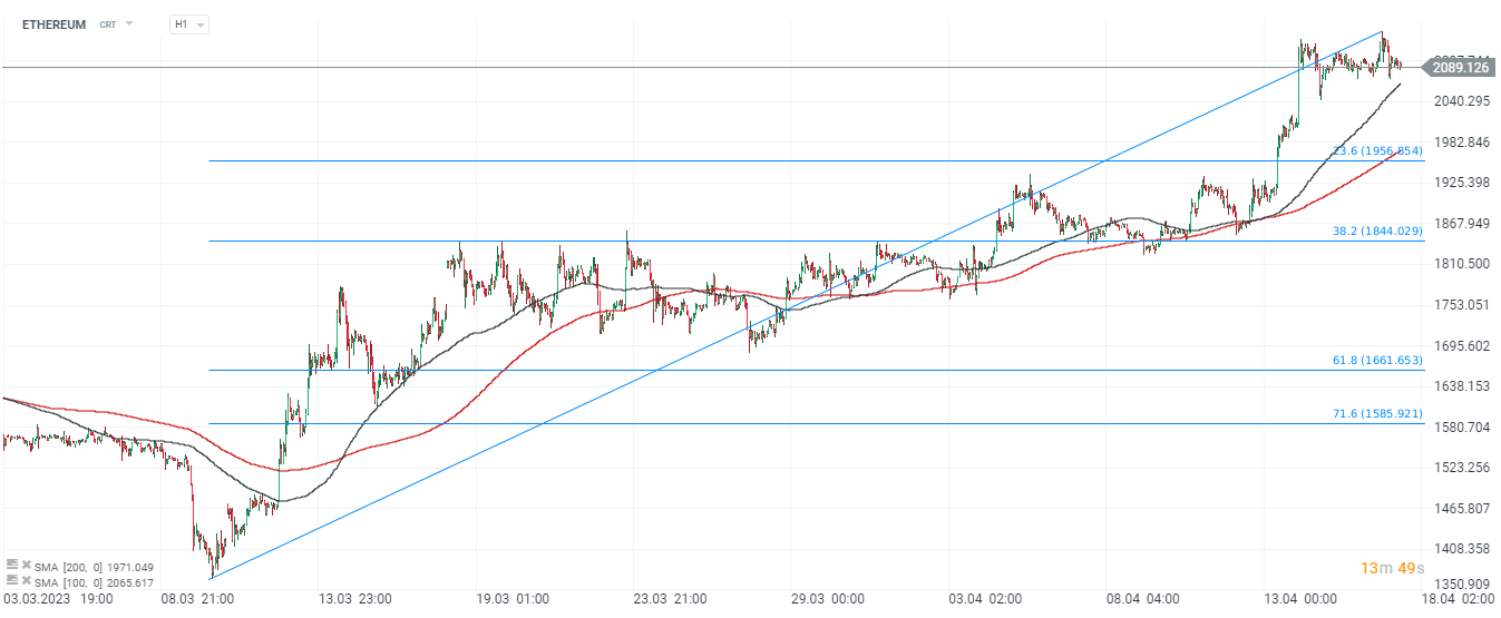 Ethereum graf, interval H1. Překonání klíčového 38,2 Fibonacciho retracementu vzestupné vlny započaté v polovině března podpořilo býčí momentum, ačkoli kupci po euforickém růstu zjevně zalapali po dechu. Klíčové podpory lze hledat v podpoře průměrů SMA100 a SMA200, přičemž druhý jmenovaný průměr (červená linie) potvrzuje, že psychologická úroveň mezi 1 950 a 2 000 USD se může v nadcházejících dnech ukázat jako klíčová k udržení. V této oblasti probíhá také 23,6 Fibonacciho retracement. Zdroj: xStation5