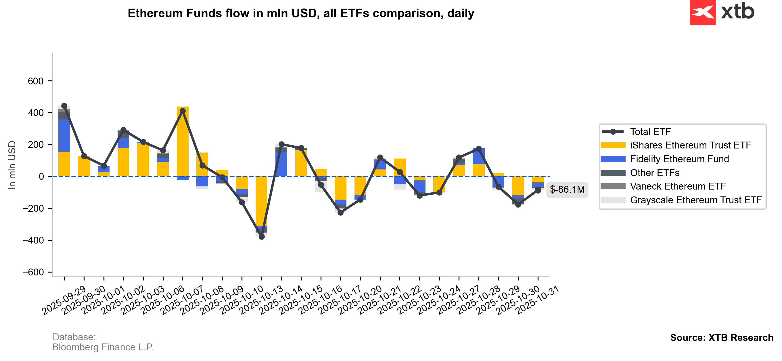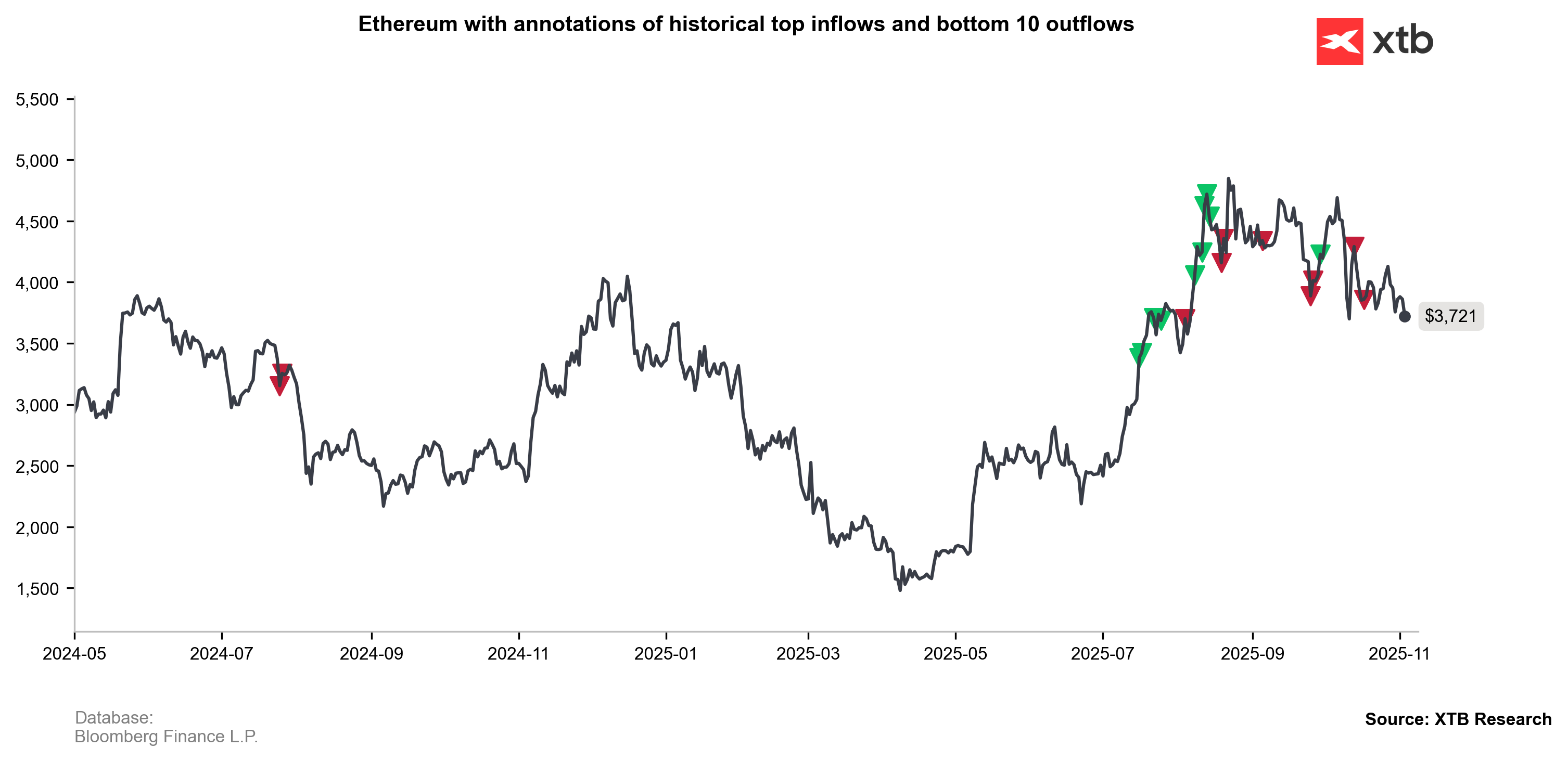 Kryptoměny zůstávají do značné míry závislé na sentimentu na akciovém trhu. Podle údajů Goldman Sachs se poprvé od prosince 2024 obrátil poměr put-call v skupině Mag7 (sedm největších technologických společností), což znamená, že implikovaná volatilita call opcí (sázky na růst cen) překročila volatilitu put opcí (sázky na pokles). Tento jev je vzácný a může signalizovat, že investoři jsou potenciálně nadměrně pozicováni pro další zisky na akciovém trhu. Slabé technické podmínky (viditelné také u Etherea) a klesající zájem o přílivy do amerických spotových ETF však do jisté míry podkopávají představy o silném podzimním oživení na kryptotrhu. V důsledku toho může trh stále více odrážet scénář z roku 2021, kdy první polovina listopadu přinesla prudký pokles kryptoměn, což vyvolalo medvědí trh, který trval až do prosince 2022.
