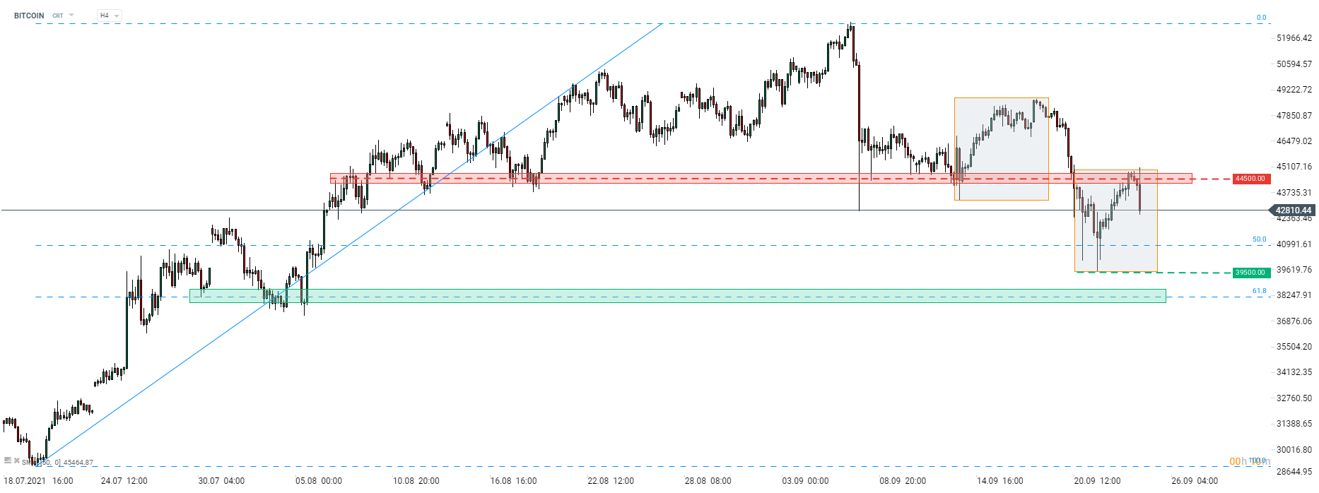 Bitcoinu se nepodařilo prorazit nad horní limitu lokální tržní geometrie v blízkosti $45 000. Tato kryptoměna si tak uchovala klesající strukturu a nemůžeme vyloučit pohyb na další lokální minima. Klíčovým krátkodobým supportem je úroveň 50 % retracementu posledního růstu ($41 500) a spodní limita tržní geometrie na $39 500. Zdroj. xStation5