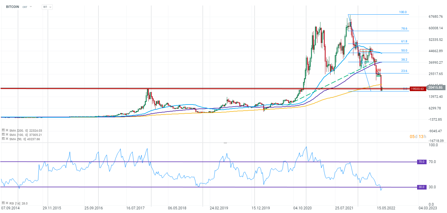 Bitcoin (BITCOIN), interval W1. Minulý víkend přinesl obrovské výprodeje největší kryptoměny a nyní se BTC snaží trvale vrátit nad úroveň 20 000 USD. Z dlouhodobého hlediska se aktuální úroveň jeví jako klíčová pro analýzu dalšího chování BTC, a to vzhledem k proražení vrcholu minulého cyklu, což se v minulosti nestalo. Zdroj: xStation 5