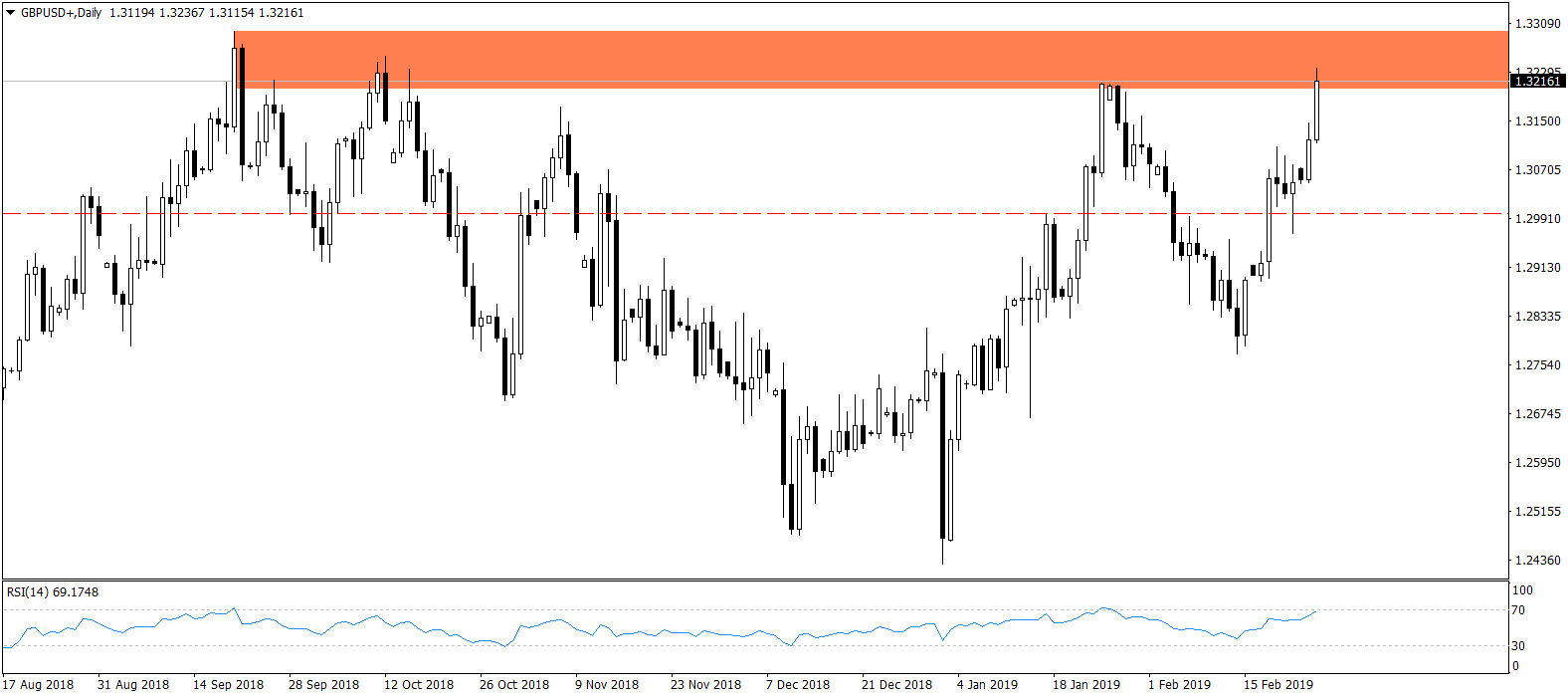 Najpravdepodobnejším scenárom vyzerá byť predĺženie dohody, čo poslalo nahor libru. Tej okrem toho pomohol aj guvernér Bank of England Carney, podľa ktorého je aktuálne na tom britská ekonomika dobre, a aj správy z tábora Labouristov, že uvažujú o podpore nového referenda o BrExite. To by mohlo získať v parlamente podporu, keďže proti BrExitu sú aj liberálni demokrati, Škóti a časť vládnucich konzervatívcov. GBPUSD poskočil k úrovni 1,32 a dostal sa do zóny rezistencie medzi 1,32 a 1,33. Pokiaľ by sa mu ju podarilo prekonať, tak sa jej z technického pohľadu otvorí priestor pre ďalší rast, naopak v prípade neúspešného ataku hrozí odrazenie sa smerom nadol. Všetko bude záležať od toho, ako sa bude vyvíjať debata o BrExite a následné hlasovania.
