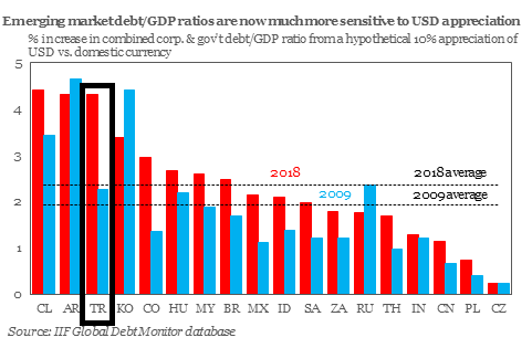 Po druhé, slabšia mena zvyšuje náklady na obsluhu dlhu v cudzích menách. Ako som písal pri príčinách, tak Turecký rast bol v značnej miere závislý od úverov zo zahraničia. Časť z nich bola denominovaná v cudzích menách. Spomedzi veľkých rozvíjajúcich sa ekonomík vzrástla citlivosť Turecka na oslabenie dolára za posledných 10 rokov s odstupom najviac. Oslabenie líry voči doláru o 10% aktuálne prináša rast celkového dlhu k HDP (vláda + súkromná sféra) o viac ako 4 percentuálne body, v roku 2009 to bola polovica. Turecko je spolu s Čile a Argentínou na čele tohto rebríčka. Len dodám, že za posledný rok oslabila líra voči doláru o 44%. Dlh k HDP teda vďaka tomu poskočil o takmer 20 percentuálnych bodov.