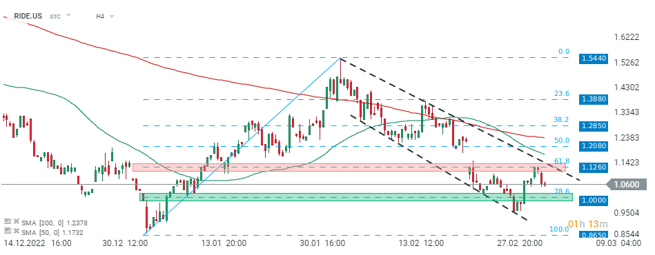 Akcie společnosti Lordstown Motors (RIDE.US) v pondělí prudce klesly, a pokud současný sentiment převládne, psychologická podpora na úrovni 1,00 USD může být ohrožena. Zdroj: xStation5