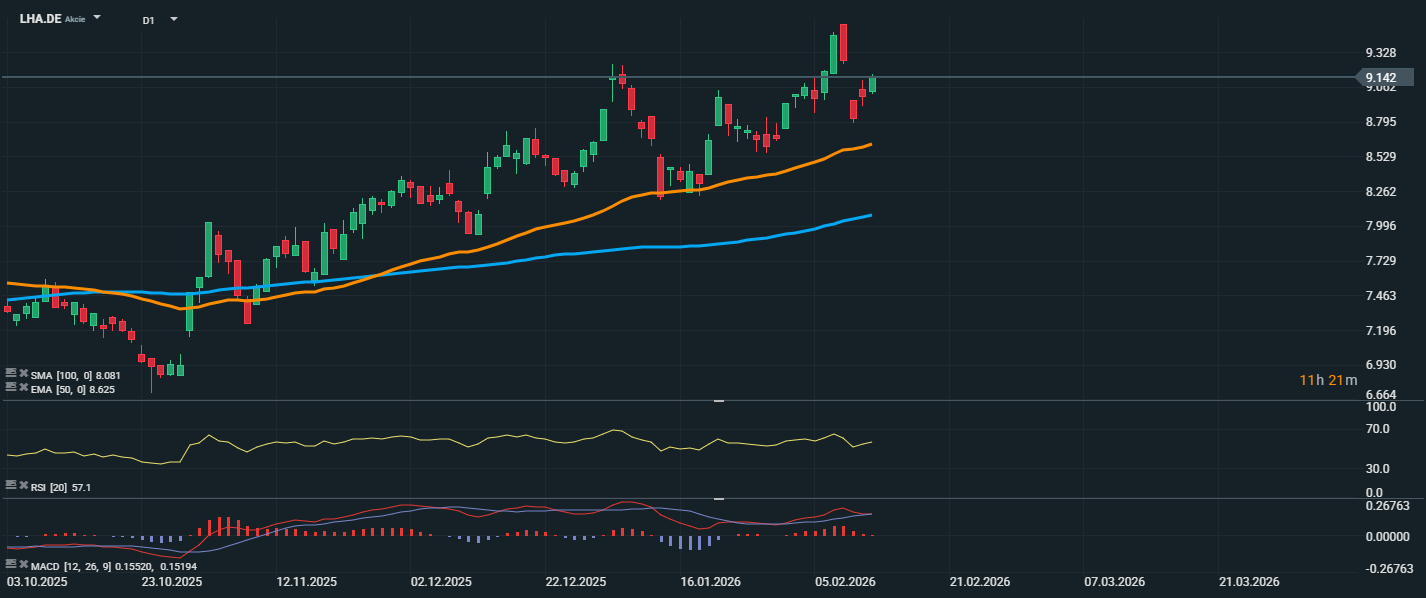 Akcie Lufthansa se obchodují kolem 9,14 EUR a pohybují se poblíž nedávných lokálních maxim v oblasti 9,30 EUR. Akcie tak zůstávají v jasném střednědobém růstovém trendu, který započal na podzim minulého roku. Cena se drží nad EMA 50 (8,63 EUR) i nad SMA 100 (8,08 EUR), což potvrzuje pokračující býčí strukturu trhu. Oba klouzavé průměry mají rostoucí sklon a vytvářejí solidní technickou podporu v pásmu 8,60–8,10 EUR. Dokud se cena udrží nad touto oblastí, zůstává trend technicky pozitivní.