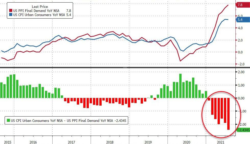 Rozdiel medzi PPI a CPI začína rýchlo rásť. Zdroj: Bloomberg cez ZeroHedge